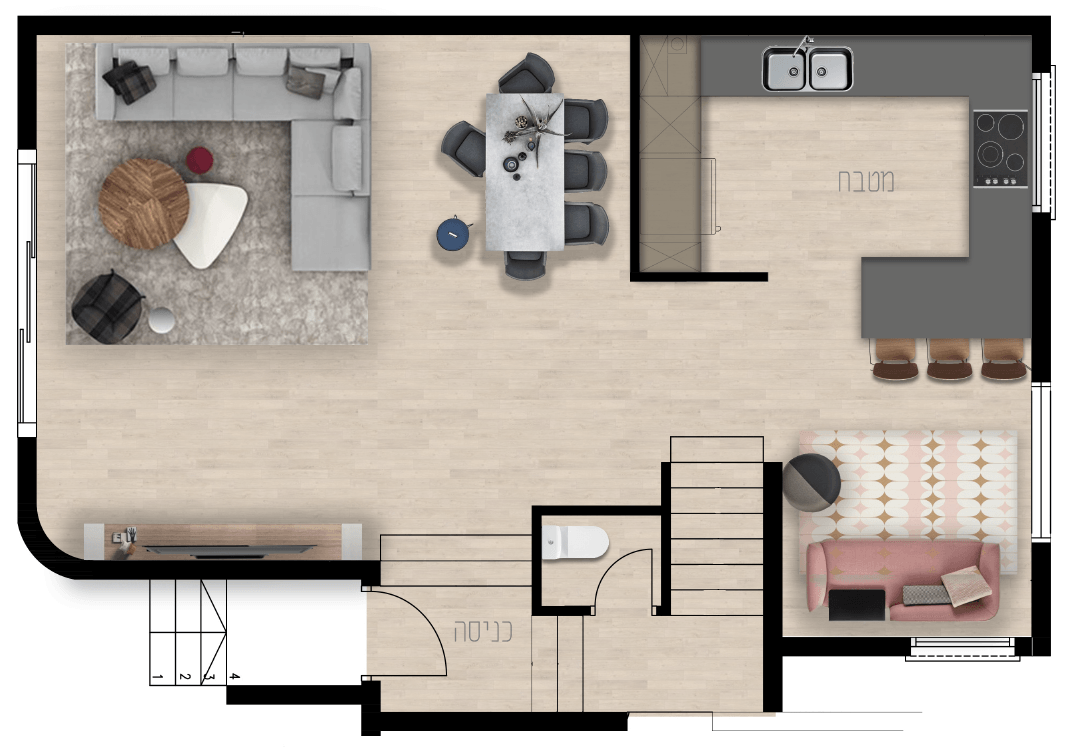 בקומת הכניסה היתה מדרגה מיותרת בין הסלון למטבח