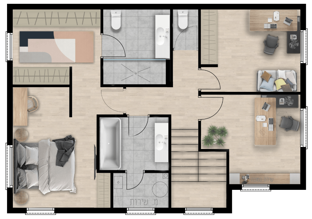 - בקומת החדרים הסבנו 2 חדרי ילדים למשרד אחד לכל בן זוג,