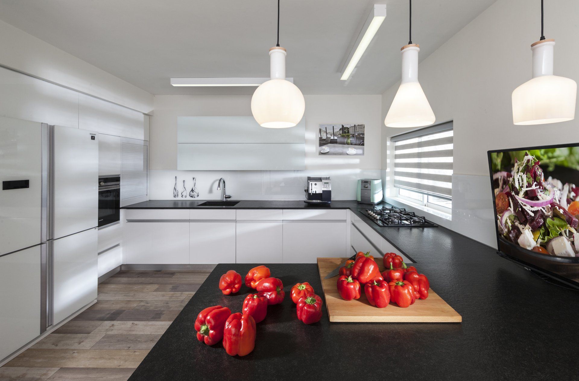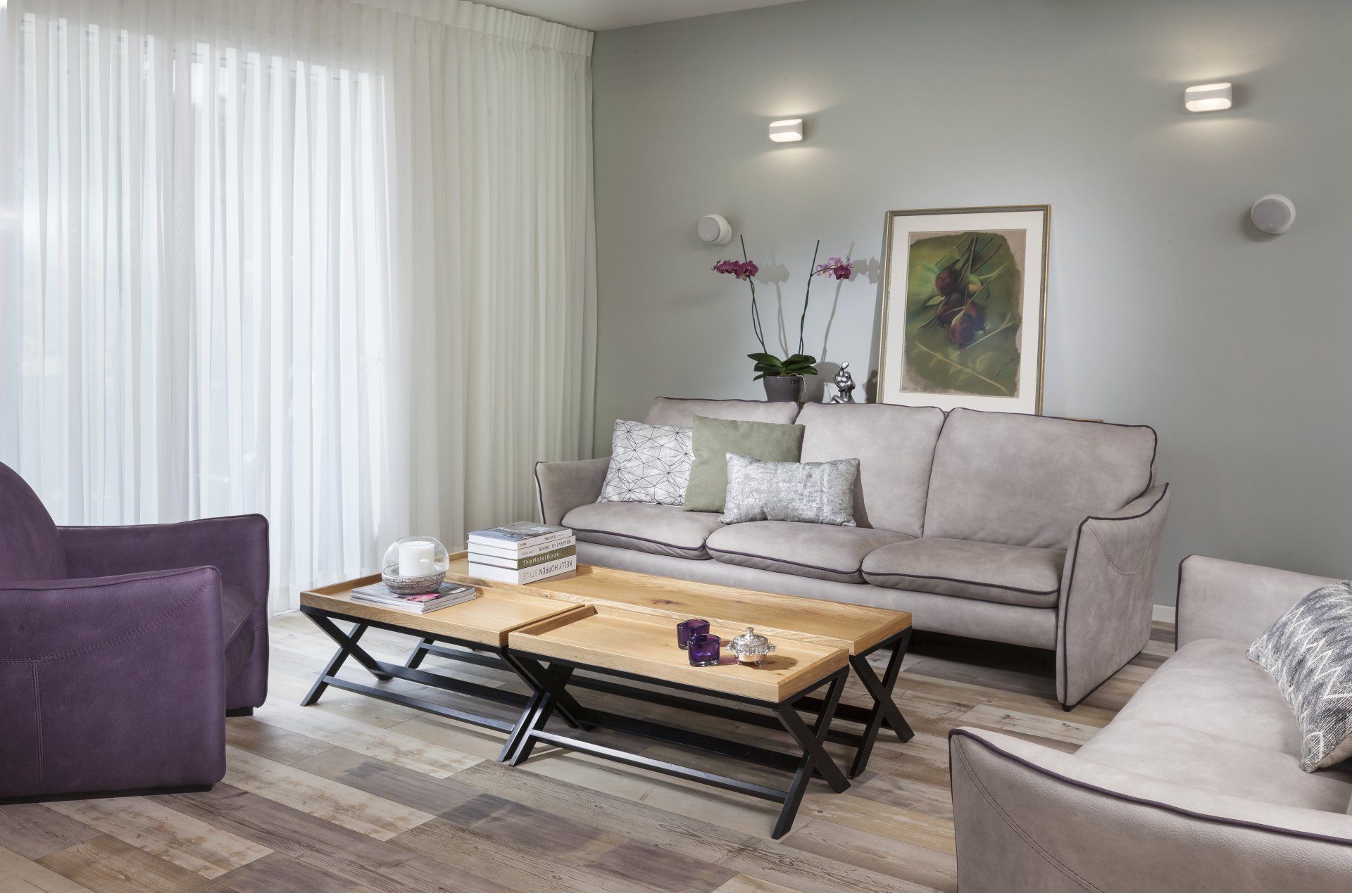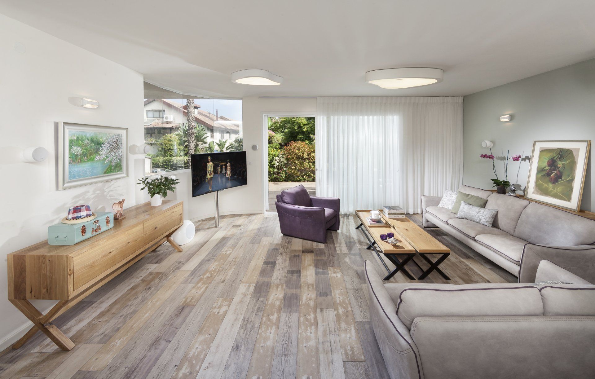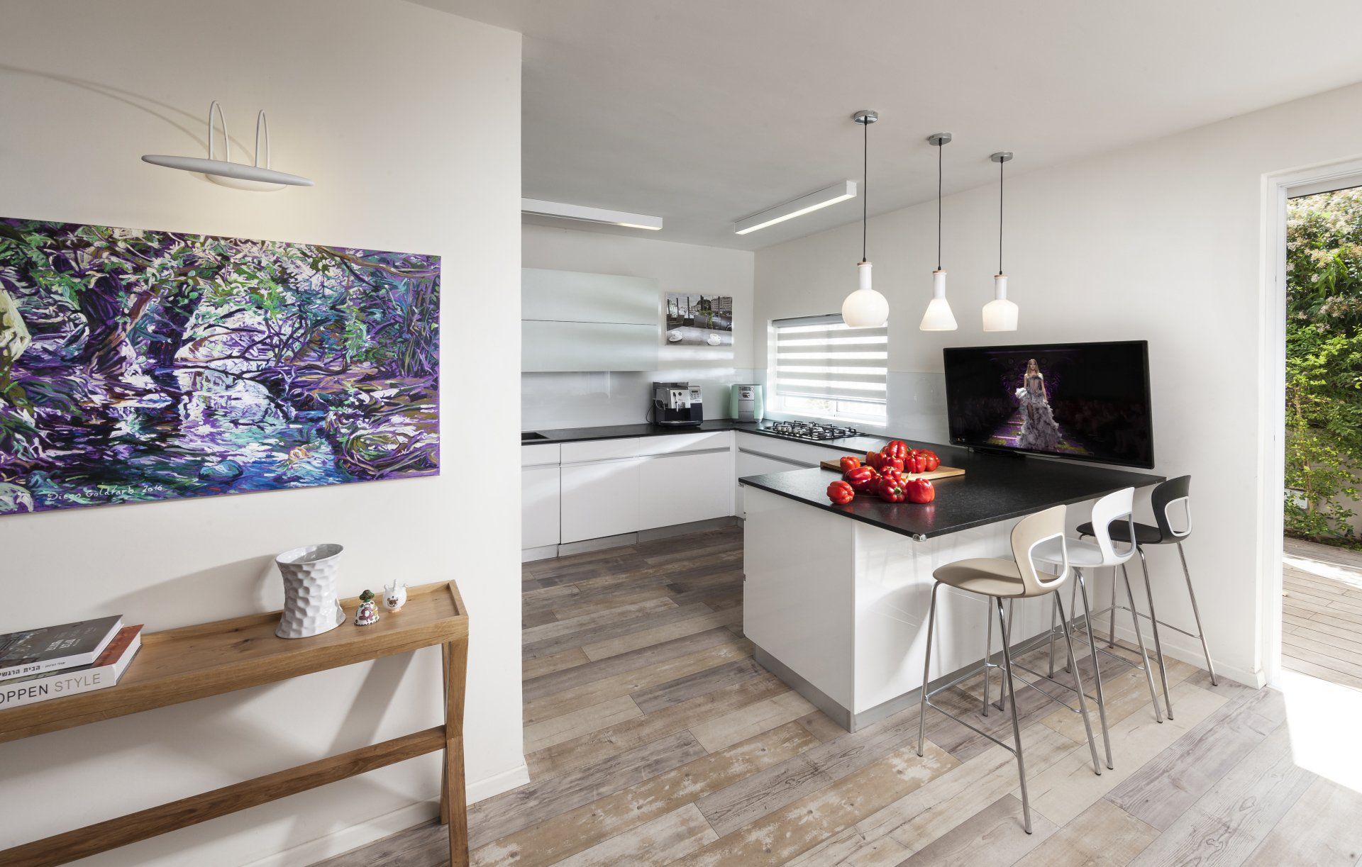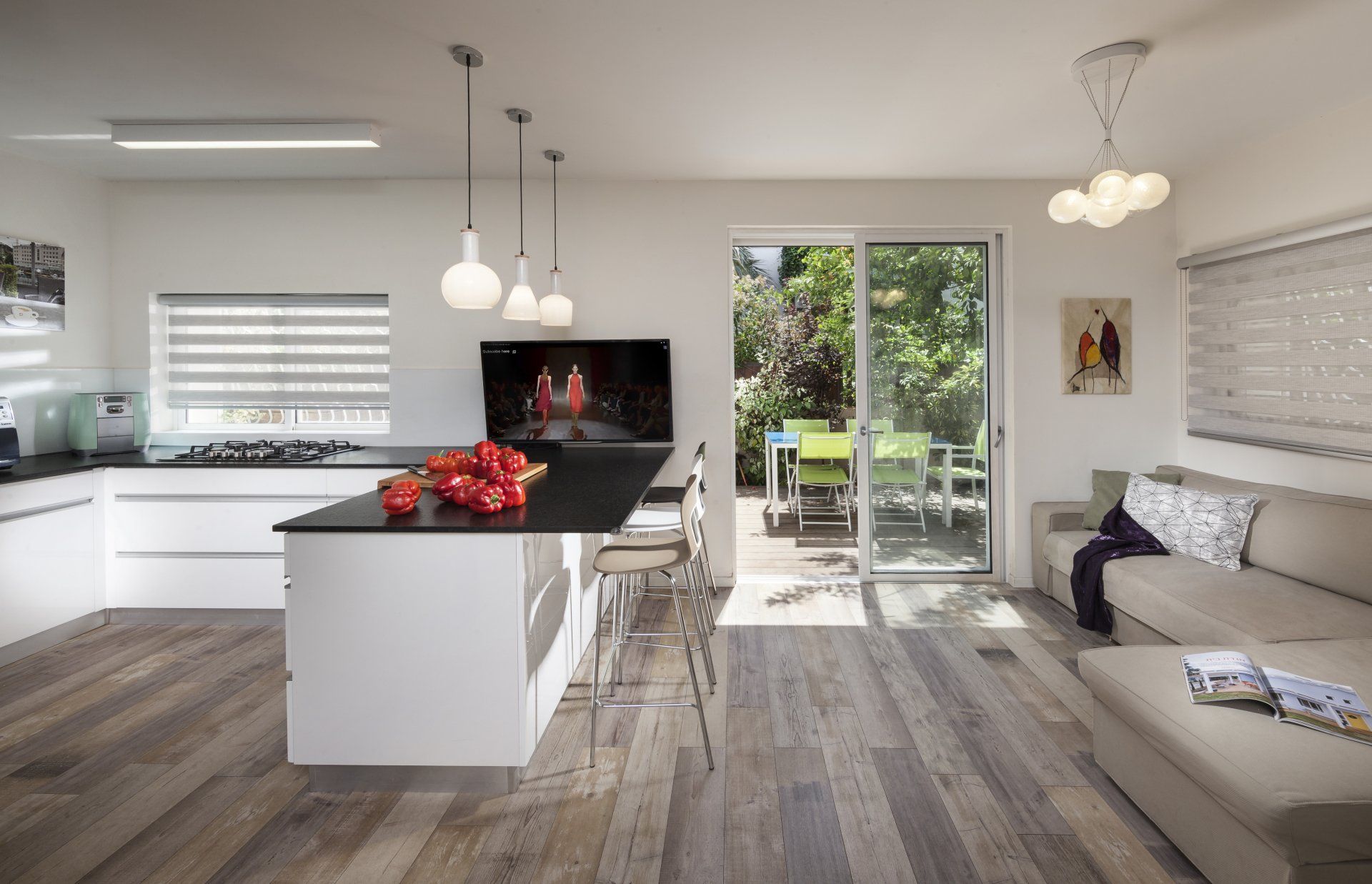 - בסלון הזזנו קיר והגדלנו את המטבח וביטלנו את המדרגה
